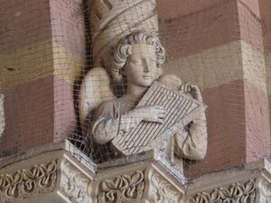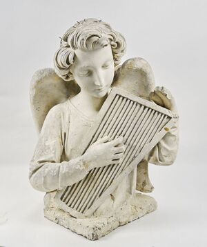 Der Oberkörper des jung anmutenden, androgyn dargestellten Engels steht auf einer rechteckigen Basis. Er ist mit einer Tunika mit rundem Halsausschnitt bekleidet. Sein welliges Haar ist rechts gescheitelt. Sein Blick ist nach unten zur Harfe hin gerichtet. Die linke Hand hält die kleine Harfe, die rechte greift in die Saiten. Auf dem Rücken sind Flügel zu erkennen. Vermutlich handelt es sich bei dem musizierenden Engel um den Abguss einer Skulptur, die der Bildhauer Josef Gasser gefertigt hat. Einer von insgesamt sechs Engeln mit Harfe, befindet sich im Paradies/Kaiserhalle des Domes zu Speyer auf einem Absatz des zur Eingangspforte hin abgestuften Rundbogens, Stufenportal 1. Abstufung rechts.