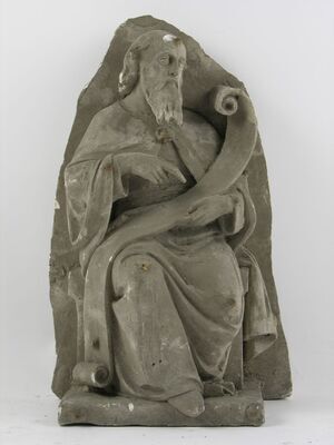 Dargestellt ist ein sitzender, jung anmutender, bartloser Prophet des Alten Testaments mit nackenlangem, gewelltem Haar. Es könnte sich um Daniel handeln, der bartlos dargestellt wird. Aus der unregelmäßig geformten Gipsplatte ist unten eine Art Podest herausgearbeitet, auf dem eine Bank steht, auf der der Propheten sitzt. Der Prophet ist in eine Tunika gekleidet, über der er einen ärmellosen, gesäumten Mantel trägt, der auf der Brust mit einer Brosche zusammengehalten wird. Unterhalb der Brosche ist der Mantel offen und fällt seitlich nach unten zur Erde. Die rechte, bekleidete Fußspitze reicht unter der Tunika über das Podest hinaus. Der rechte Arm ist angewinkelt. Die Hand hält den oberen Teil der Schriftrolle, die diagonal über das linke Bein nach unten abrollt. Die Schriftrolle ist das Attribut zahlreicher Heiliger im Christentum. Der Blick des Propheten ist nach rechts, leicht nach oben gerichtet. Messpunkte aus Metall sind auf der Oberfläche des Reliefs zu sehen.