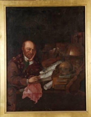 Porträt eines Gelehrten (aus dem 16. Jh.) im Arbeitszimmer mit Büchern, einem Globus, Geige und einem Totenschädel. Die Darstellung des Ambientes ist mit der Zusammenstellung auf dem Pedant (HM_9_02635) identisch. Der Philosoph wird dargestellt mit Gelehrtenmütze, Bart und pelzbesetzter Schaube. Er sitzt am Tisch und liest in einem Manuskript. Gegenstück zu HM_0_2634