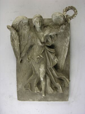 Halbrelief mit teilweise sehr plastisch ausgearbeiteten Gestalten auf einer rechteckigen Gipsplatte. Dargestellt ist das Jüngste Gericht. In der Mitte der Szene thront Jesus auf ondulierenden Linien, die Wolken bzw. den Himmel symbolisieren sollen. Er ist gekleidet in eine Tunika und einen weiten Umhang. Unter dem Erdboden, der in Bögen die Grenze zur Hölle darstellt, weinen und jammern Menschen im (Fege-) Feuer. Sie halten mit gesenktem Kopf die Hände vor das Gesicht oder erheben hilfeflehend die Arme empor zu Jesus. Zur Rechten Jesu hebt ein Engel einen der Menschen aus den Flammen empor. Links von Jesus sitzt Maria (?), die mit ihrem rechten Arm auf Jesus weist, ihr linker Arm zeigt nach unten zu den schreienden Menschen. Die Gipsplatte zeigt Beschädigungen: die rechte Ecke ist abgebrochen. Die Oberfläche des Reliefs ist zum Teil stark abgerieben. Am oberen Rand ist eine Aufhängemöglichkeit angebracht.
