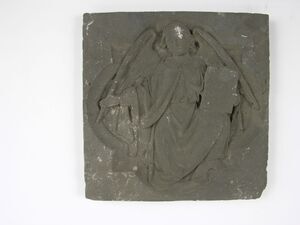 Dargestellt ist ein sitzender Matthäus, der als Engel dargestellt ist. Seine Flügel sind leicht ausgestellt. Er trägt etwa schulterlanges Haar. Gekleidet ist er in ein weites Gewand, das in der Taille gegürtet ist und ein darüber gelegten Pallium. Das Neue Testament, das er mit der linken Hand mit der Umschlagseite zum Betrachter hält, ist geschlossen und auf seinem linken Knie abgestützt. Der rechte Arm ist ausgestreckt, die rechte Hand ist offen und zeigt zum Betrachter. Das in Farbe und in Holz umgesetzte Modell, das nun in einen Vierpass eingefügt ist, befindet sich an der Kanzel in der Kirche St. Marien in Neustadt/Weinstraße. Matthäus hält dort im Gegensatz zum Gipsmodell kein Buch, sondern ein Schriftband in der Hand.