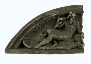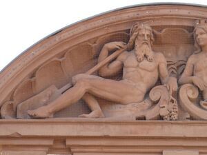 Modell der linken Hälfte des Tympanons am Ostgiebel der Alten Münze in Speyer. In der Tiefe des Tympanons ist eine Muschel eingebracht, in deren Höhlung die allegorische Darstellung des Rheins als Flussgott Rhenus mit schulterlangem, gewelltem Haar, langem Oberlippenbart und einem in der Mitte geteilten Kinnbart liegt. Der Flussgott hält mit dem angewinkelten Arm ein Ruder. Der linke Arm liegt auf einer stilisierten Welle. Das rechte Bein ist angewinkelt und das linke ausgestreckt. Der linke Zeigefinger deutet auf eine Weintraube. An der Oberfläche sind Abschürfungen. Der Schmuck, Tympanon am Ostgiebel des Gebäudes, wurde anlässlich des Umbaus vom Architekten Heinrich Jester entworfen. Die Bildhauerarbeit wurde durchgeführt von Renn und Johann Häfner. Das Modell der rechten Seite des Tympanons auf der das weibliche Symbol der Stadt Speyer, die Filia Spirae, die den Dom hält, dargestellt ist, fehlt in der Sammlung der Gipse Gottfried Renns.