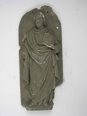 Rechteckiges Relief, dessen oberer Bereich abgerundet ist. Auf einem in den Raum herausragenden Sims steht ein Mann. Gekleidet ist er in ein bodenlanges, faltenreiches Gewand. Er hat kurzes lockiges Haar und trägt einen Vollbart. Hinter seinem Kopf ist ein Heiligenschein zu sehen. In den Händen hält er ein Buch hoch, auf dem zwei Schlüssel abgebildet sind. Deshalb könnte es sich hier um eine Darstellung des Apostel Petrus handeln.
