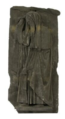 Dargestellt ist ein Mann mit Vollbart, langem bis über die Ohren reichendem, gewellten Haar und Mitra. Sein langer, welliger bis zur Brust reichende Kinnbart ist in der Mitte geteilt. Er steht auf einem aus der Gipsplatte herausgearbeiteten Sims. Sein rechter Fuß ist etwas vorgestellt. Gekleidet ist er in ein Bischofsornat mit Pallium und Messgewand. In seiner linken Hand hält er ein geschlossenes Buch, auf dem vier Äpfel liegen. Aufgrund der Attribute handelt es sich bei dem dargestellten um Bischof Nikolaus von Myra. Ein Öse zum Aufhängen ist oben in die Gipsplatte eingelassen.