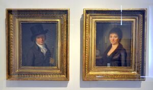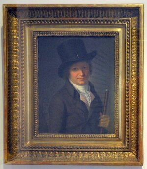 Porträt eines wohlhabenden Bürgers vor bräunlich-grauem Hintergrund. Der Blick des Porträtierten ist auf den Beschauer gerichtet. Er trägt einen schwarzen Zylinderhut mit Band, der Stirn und Augen beschattet, einen braunen Redingote, und eine weiße Halsbinde. In der erhobenen Linken trägt er Handschuh und Spazierstock. Datiert 1803 in der Uhr des zugehörigen Damenporträts (HM_1972_0100_b; dort auch bezeichnet "KYMLI, A PARIS 1803"). Franz Peter Joseph Kymli wurde an der Zeichnungsakademie in Mannheim ausgebildet. Karl Theodor von der Pfalz gewährte ihm 1775 ein Paris-Stipendium. 1776 stellte er im Salon du Colisée aus, in den Jahren 1779 bis 1787 im Salon de la Correspondance. 1789 wurde er Legationsrat unter dem Gesandten Karl von Sickingen, zehn Jahre später entließ ihn Max IV. Joseph aus den kurfürstlichen Diensten und entzog ihm die Besoldung. Kymli blieb offenbar in Paris, wo er im Faubourg Saint-Germain wohnte. Er war mit einer Tochter von Jacques Louis David verheiratet.