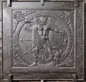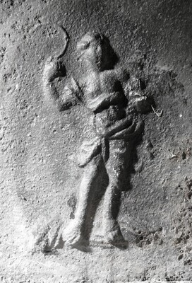Eine runde Platte mit Stegrand im Spiegel, zur Aufnahme eines Gefäßes. Sie ist mit Blumensträußen und Streublumen bemalt. Die Form ist ziemlich verdrückt, es ist kein festes Aufstehen der Platte möglich. Blumenarrangements in der breiten Kehlzone dreifach, einmal im Zentrum. Malerei in charakteristischer schwarzer Umrisszeichnung. Eingepresste Marke PHI.