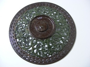 Der durchbrochene Teller ist durch vom Mittelkreuz aufwachsende und sich nach beiden Seiten spiralig einrollende Ranken in vier Segmente geteilt. Im Mittelkreis kreuzförmig angeordnete akanthusartige Blätter, umgeben von einem Kreisring mit sich überschneidenden Spitzbögen. Äußerer Kreisring als Rahmen gefüllt durch 2 geflochtene Wellenbänder. Auf das Eisen aufgebrachte Emailfarben und Goldbronze, typisch für Ende 19. Jh.: Rankenwerk und Blattkreuz Russisch-Grün, Spitzbögen und Rand in Braun. Flechtrand, Spitzbögen und Teile des Blattkreuzes zusätzlich goldbronziert.