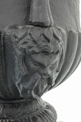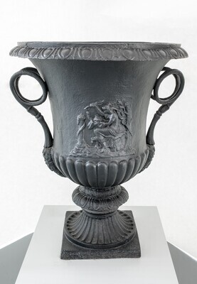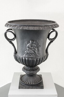 Eisenguss; große Kratervase, Vasenkörper mit Götterszenen der Antike im Relief verziert. Ursprüngliche Funktion: Ziervase im Freien. Aus sechs Teilen (Sockel / Fuß - Vasenkörper - 2 Griffe - 2 Reliefs) zusammengesetzte klassizistische Kratervase. Auf quadratischem Sockel (35 x 35 x 4,5) runder, mehrmals eingezogener Fuß, im unteren Teil kanneliert, Rand leicht hochgezogen. Seitliche dachartig überstehender Nodus mit Eierstabmotiven. Darüber der kelchartige Vasenkörper, im unteren Fünftel godroniert (Eierleiste). Seitlich auf der Eierleiste je eine reliefierte bärtige Maske (Silen?). Von deren lanzettblattverziertem Haupt ausgehend ein sich nach oben verjüngender, sich dann nach ca. 15 cm zu zwei nach außen stehenden Ringen (Griffen) gabelnder Stab. Die Gabelung mit Akanthusverzierung. Auf der glatten Wandung des Vasenkörpers über der Godronierung vorn und hinten je ein antikisierendes Relief. Die Ziervase ist im Musterbuch 1 der Sayner Hütte von 1823 als Lithographie nach einer Zeichnung von Carl Osterwald abgedruckt. In Stein gesetzt von seinem Bruder Georg Osterwald.