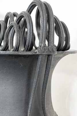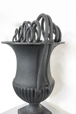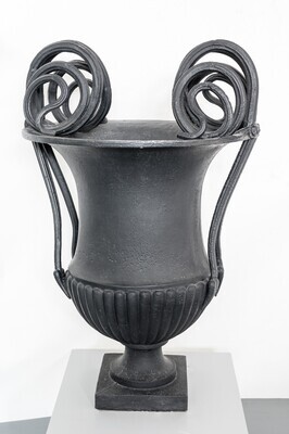 Eisenguss; große Kratervase, sog. "Schlangenvase". Ursprüngliche Funktion: Ziervase im Freien. Aus sechs Teilen (Sockel / Fuß - Vasenkörper - 2 x 2 Eisenbestandteile) zusammengesetzte große klassizistische schlichte Kratervase. Auf quadratischem Sockel (31,2 x 31,2 x 6) runder, leicht eingezogener Fuß, nach ca. 10 cm in den kelchförmigen Vasenkörper übergehend. Im unteren Drittel des Vasenkörpers godroniert (Eierleiste). Von der Eierleiste ausgehend je zwei gegenständige, im Abstand von ca. 16 cm angebrachte runde Eisenbänder, nach oben zusammenlaufend und in je drei "Schlangenrundungen" über die Lippe der Vase hinweg nach innen gedreht, sodass je sechs gegenständige von innen nach außen kleiner werdende Rundungen entstehen. Die Ziervase ist im Musterbuch 1 der Sayner Hütte von 1823 als Lithographie nach einer Zeichnung von Carl Osterwald abgedruckt. In Stein gesetzt von seinem Bruder Georg Osterwald.