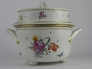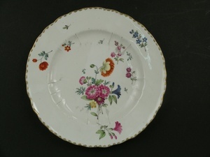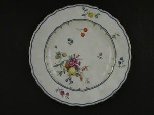 Teller mit stark geschwungenem Rand. Die Ränder sind durch Linien in Gold und in Blau dekoriert. Im Spiegel sind ein Früchtebouquet und Streublumen aufgemalt. Die Fahne verzieren Streublumen. Blaumarke CT, eingeritzt F II 0 und 86.