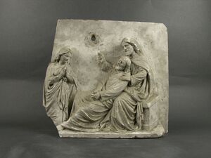 Halbrelief auf einer im oberen Teil abgerundeten, rechteckigen Gipstafel, aus der unten ein Sims herausgearbeitet ist. Jesus bekrönt mit Gloriose und einer Dornenkrone im schulterlangen, welligen Haar kniet vor einem dichten Dornbusch. Seine Augen blicken zu einem Lamm, vom Betrachter aus gesehen links unten, das sich im Busch verfangen hat. Gekleidet ist Jesus in eine Tunika und einen lose über der Schulter liegenden Umhang. Mit beiden Händen teilt er die Zweige über dem am Boden liegenden Lamm, das zu Jesus aufsieht. Ein rundes Loch im Rundbogen der Gipsplatte diente zur Befestigung an einer Wand.