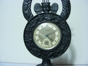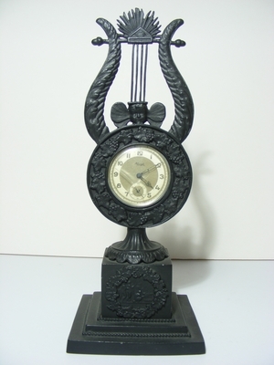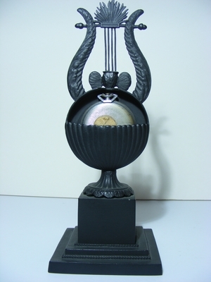Eisenguss; Nachguss Firma Buderus Hirzenhain; Taschenuhrhalter mit Lyra. Auf Kubischem Sockel einschwingender kannelierter Fuß mit kreisförmigem Gehäuse, von Weinfries gerahmt. Dahinter Halbmuschel zur Aufnahme der Uhr. Darüber Lyra, deren Saiten auf einem Engelsköpfchen ruhend in das strahlenförmig umkränzte Symbol des Auges Gottes im Dreieck übergehen. Am Sockel vorne umrahmt ein Kranz aus Weinlaub eine antike Szene. Der Sockel ist auf eine quadratische Plinthe mit kleiner Eierstabverzierung montiert. Dieser Taschenuhrhalter ist im Musterbuch 2 der Sayner Hütte abgebildet und wurde in allen drei königlich-preußischen Eisengießereien in Gleiwitz, Berlin und Sayn hergestellt.