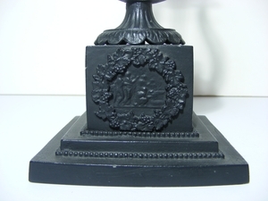 Eisenguss; Nachguss Firma Buderus Hirzenhain; Taschenuhrhalter mit Lyra. Auf Kubischem Sockel einschwingender kannelierter Fuß mit kreisförmigem Gehäuse, von Weinfries gerahmt. Dahinter Halbmuschel zur Aufnahme der Uhr. Darüber Lyra, deren Saiten auf einem Engelsköpfchen ruhend in das strahlenförmig umkränzte Symbol des Auges Gottes im Dreieck übergehen. Am Sockel vorne umrahmt ein Kranz aus Weinlaub eine antike Szene. Der Sockel ist auf eine quadratische Plinthe mit kleiner Eierstabverzierung montiert. Dieser Taschenuhrhalter ist im Musterbuch 2 der Sayner Hütte abgebildet und wurde in allen drei königlich-preußischen Eisengießereien in Gleiwitz, Berlin und Sayn hergestellt.