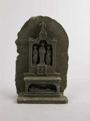 Relief eines dreistufigen auf einem Podest stehenden Altars. Der untere Bereich des Altars zeigt florale Verzierungen, die jedoch nur angedeutet und nicht herausgearbeitet sind. In der Mitte des unteren Teils des Altars befindet sich ein, einem Portal ähnelnder Vorsatz, in dessen Mitte eine Kreuzigungsgruppe grob dargestellt ist. Über dem oben verbreiterten Altartisch befindet sich ein mächtiger, als Treppengiebel gestalteter Altaraufsatz. In einer Nische im mittleren, höheren Giebelfeld ragt eine Konsole hervor, auf der Maria mit Jesuskind thront. In den beiden rechteckigen Nischen rechts und links knien, Maria zugewandt, betend je ein Engel. Die floralen Verzierungen der drei Nischen bilden gotisch anmutende Spitzbögen. Auf den dachförmigen Abschlüssen der niedrigeren Giebel stehen am Rande ebenfalls gotisch anmutende Türmchen. Über dem Dach des großen mittleren Giebels erhebt sich eine Kreuzigungsgruppe. Unter dem gekreuzigten Jesus stehen zwei Gestalten, die nur grob ausgearbeitet sind.