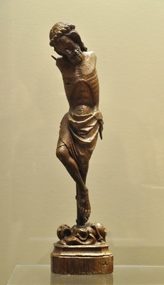 Altar mit Aufbau. Der Aufbau ist in drei Kammern aufgeteilt in der drei grob gestaltete Figuren stehen. In der Mitte ist die größte der drei Figuren, vermutlich Maria. Nach ihrer Haltung nach zu beurteilen könnte sie das Christuskind in den Armen halten, dieses ist aber nicht ausgestaltet. Links und rechts sind zwei kleinere Gestalten, die nicht eindeutig identifizierbar sind. Die Bögen und das Dach des Altars sind reichlich verziert. An der Spitze ist ein Kreuz zu sehen.