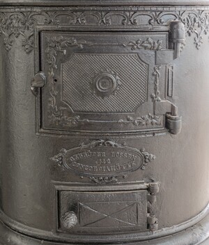 Eisenguss; ovaler Ofen sog. Wormser Ofen; Beschriftung vorne im Oval: "GEBRÜDER LOSSEN CONCORDIAHÜTTE No. 2".