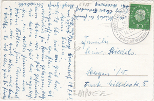 Karte im Schwarz/weiß Druck mit gewelltem Rand. Das Bild zeigt die Kreuzung Hauptstraße/Schützenstraße mit einem markanten Baum und einem darunter parkendes Fahrzeug. Das dritte Haus auf der linken Seite in der Straßenengstelle wird als "Oberes Tor" bezeichnet. Darüber ragt die Kirche.