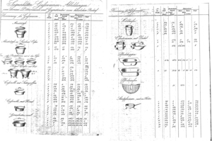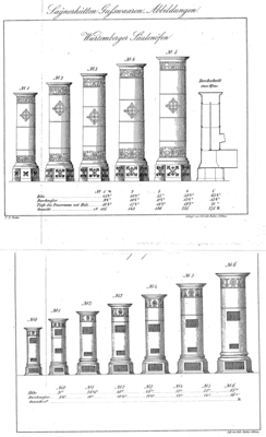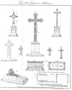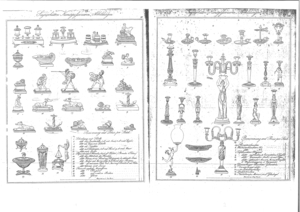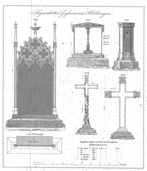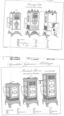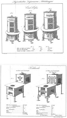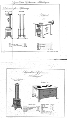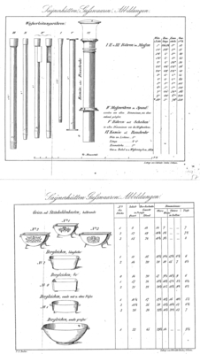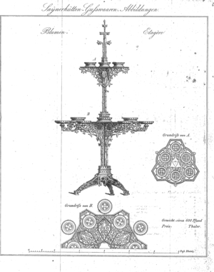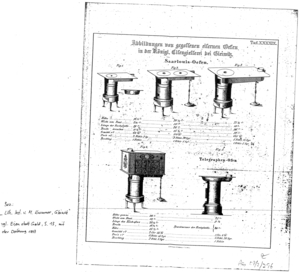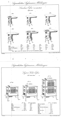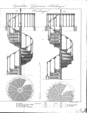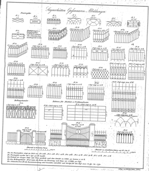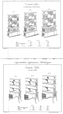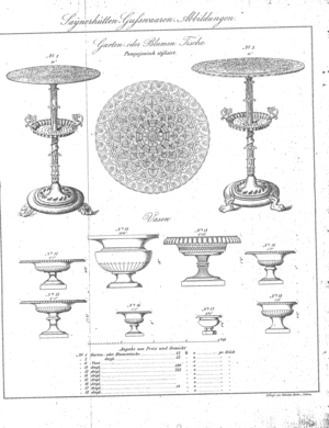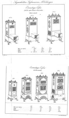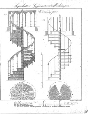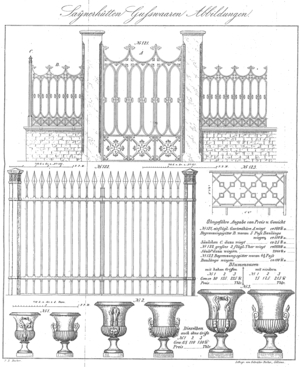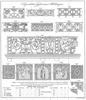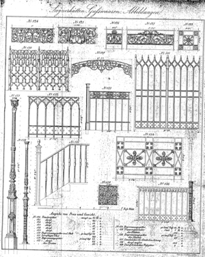 Musterbuchseiten bzw. einzelne Katalogseiten der Gusswaren der Sayner Hütte, 18320 bis 1840er Jahre (50 Blätter, Kopie). sog. Musterbuch 2 (um 1846): Die umfangreichste Sammlung an einzelnen Musterbuchblättern bzw. Katalogseiten der Sayner Hütte mit insgesamt 78 einzelnen Abbildungstafeln und einer Textseite zur Erklärung der Wendeltreppen liegt uns nicht im Original vor. Es ist kein Deckblatt oder Einband erhalten, aus welchem eventuell hervorgehen könnte, ob es sich überhaupt um ein gebundenes Musterbuch handelt und wenn ja wann es genau entstanden sein könnte. Die einzelnen Tafeln sind überschrieben mit dem Titel „Saynerhütten Guhswaaren – Abbildungen“ und bis auf die ersten vier Tafeln nicht durchnummeriert. Sie sind unten rechts mit dem Namen des ausführenden Lithographen bzw. der jeweiligen lithographischen Anstalt, also des Druckers, und links meist mit dem Namen des Urhebers der vorgelegten Zeichnung versehen. Es ist möglich, dass es keine gebundene Ausgabe gab, sondern die Blätter einzeln ausgegeben wurden, dies verstärkt die Tatsache, dass in Archiven meist nur einzelne Seiten zu finden sind.