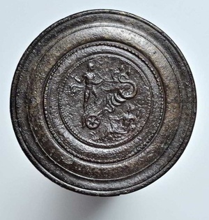 Die Vorderseite des Medaillons für Antoninus Pius zeigt die Büste des Kaisers mit der Umschrift: Antoninus Aug(ustus) Pius P(ater) P(atriae) Tr(ibunicia) P(otestate) XI Co(n)s(u)l IIII. Antoninus Augustus, der sich recht Verhaltende, Vater des Vaterlandes, zum 11. Mal versehen mit der tribunizischen Gewalt, zum 4. Mal Konsul. Die Rückseite lässt in einem von zwei geflügelten Schlangen gezogengen Wagen Triptolemos erkennen, der Samen auf die Erde streut, darunter befindet sich inmitten von Ähren die Erdgöttin Tellus. Dem Mythos nach war Triptolemos der Verbreiter des Ackerbaus. Offenbar wurde das Medaillon zum zehnjährigen Regierungsjubiläum von Kaiser Antoninus Pius im Jahr 147/148 n. Chr. herausgebracht und an einen hochgestellten Treverer vergeben.