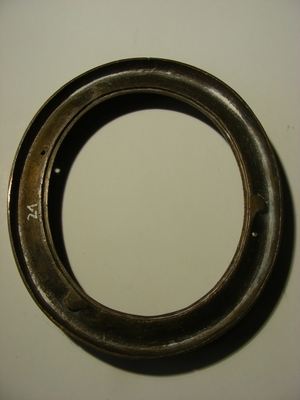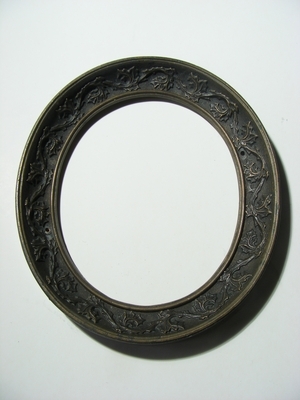 Ovaler Rahmen aus Bronze gegossen, verziert mit einer Blattranke. Ein solcher Rahmen war für die Apostelmedaillons "PETRUS" und "PAULUS" vorgesehen. Es handelt sich hierbei um ein Modell. Die Petrus- und Paulus-Reliefs mit Rahmen wurden ursprünglich in der Sayner Hütte ab Mitte des 19. Jahrhunderts bis zu ihrer Schließung im Dezember 1926 gegossen. Diese Reliefs waren sehr beliebt und wurden auch in anderen Gießereien nachgegossen u.a. auf der Concordiahütte in Bendorf-Mülhofen aber auch in der Gießerei Wölkingsthal in Mähren (Gießerei Bolikov). Wölkingsthal war neben der Gießerei Blansko, das bedeutendste Eisenwerk Mährens. Gegründet 1810 von Vinzenz Euseb Zeßner Freiherr von Spitzberger und dem Geologen Gregor Graf Rasumofsky, bestand das Eisenwerk bis 1878. Vgl. Inventare 6.019, 6.020
