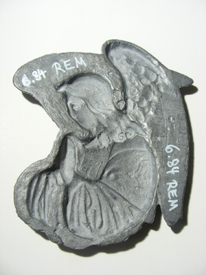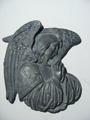 Zinnmodell als Relief, das einen betenden Engel darstellt. Es ist das Gegenstück zur Inventarnummer 6.085 und beide Modell wurden zur Herstellung von Eisengüssen verwendet, die als Verzierung von Gebetsstühlen dienten wie beispielsweise in der Abteikirche in Bendorf-Sayn. Die beiden Engelreliefs sind im Musterbuch 2 der Sayner Hütte in einer Lithographie der Gebrüder Becker in Koblenz abgebildet. Auf dieser Musterbuchseite der "Saynerhütten Gußwaaren Abbildungen" (siehe Inventarnummer 4.601) sind Grabmonumente und verschiedene Verzierungen für ebensolche dargestellt.