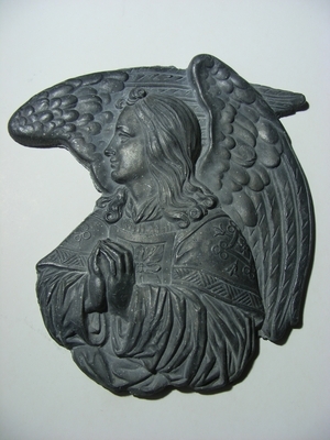 Zinnmodell als Relief, das einen betenden Engel darstellt. Es ist das Gegenstück zur Inventarnummer 6.084 und beide Modell wurden zur Herstellung von Eisengüssen verwendet, die als Verzierung von Gebetsstühlen dienten wie beispielsweise in der Abteikirche in Bendorf-Sayn. Die beiden Engelreliefs sind im Musterbuch 2 der Sayner Hütte in einer Lithographie der Gebrüder Becker in Koblenz abgebildet. Auf dieser Musterbuchseite der "Saynerhütten Gußwaaren Abbildungen" (siehe Inventarnummer 4.601) sind Grabmonumente und Verzierungen für ebensolche abgebildet.
