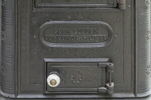 Gusseiserner sog. Koblenzer Ofen Nr. 0 mit Galerie ohne Reguliereinrichtung aus der Produktion der Concordiahütte der Gebrüder Lossen in Mülhofen (heute: Bendorf-Mülhofen). Aufbau: Vier angeschraubte Füße, drei Etagen, die unterste als Aschenfall mit Bodenplatte und mit Bügelhebel verschließbarer Aschentür, der Aschenkasten fehlt, die mittlere Etage als Feuerraum, innen mit ovalem Eisenrost und mit Schamott ausgemauert. Durch Bügelhebel verschließbare Fülltür mit ovalem Ende und einer mit Klemmverschluß verschließbaren kleinen Reinigungstür am unteren Ende, die dritte Etage als Kochraum mit drei Einlegeringen versehener Herdplatte, drei Verkleidungsplatten. Rückseitig oben Mitte Ofenrohranschluss, durchbrochene Tür mit Bügelhebel, unterhalb der Tür rechteckiger Vorsprung, ein Abschlussrahmen mit Herdplatte und eine aus vier Teilen zusammengeschraubte Galerie. Jede Etage besteht aus vier Platten, die Seitenplatten durch Bügel der Stirn- und Rückseite gehalten, die Platten der 2. und 3. Etage in Rahmen eingesetzt, die drei Etagen und der obere Rahmen durch zwei unter der Bodenplatte verschraubte Eisenstäbe befestigt. Obere Herdplatte mit verschließbarem Loch und Galerie lose aufgelegt. Der Kochraum ist an den Seiten und hinten durch separate Platten begrenzt. Die Türgriffknöpfe bestehen aus weißglasierter Keramik.