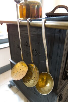 Eisen / Guss, Keramik, Messing, Schamottsteine; um 1900; sog. Tafelherd mit Wärmeofen (oder Trockenspind) und Reguliervorrichtung Nr. 7 (vgl. Inv.-Nr. 7.3337); Beschriftung auf der Vorderseite: "7" und "GEBR. LOSSEN, CONCORDIAHÜTTE". Der Herd besteht aus einem Rahmen mit Bodenplatte auf vier angeschraubten Füßen. Er weist zwei Etagen auf. Die Untere dient dabei als Wärmeofen mit zwei Türen und einer oberen Abdeckplatte mit rechteckiger, durch Platte verschließbaren Öffnung. Die obere Etage verfügt über je eine Bratofen-, Zugreinigungs-, Füll- und Aschentür. Die beiden letzteren sind mit einer Reguliervorrichtung ausgestattet. Bratofen und Aschenfall haben eine quaderförmige Verkleidung. Die Feuerstelle ist innen ausgemauert. Auffällig sind einige Messingteile am Herd, nämlich der Wasserkasten mit Deckel und die Reling (an den Seiten und vorne umlaufend eine unter dem Rahmen festgeschraubte Messingstange). In die obere Herdplatte integriert sind der Kochplattenrahmen mit Einlegeplatten, ein ovaler Ofenrohranschluss und die Wasserkastenaussparung. Außerdem verfügt der Herd über eine Zugabsperrklappe und einen Aschenkasten. Jede Etage besteht aus vier Platten. Dabei werden die Seitenplatten durch Führungsstege der Stirn- und Rückseite gehalten- Die Platten sind im Rahmen eingesetzt. In den vier Ecken durch den Herdplattenrahmen geführte und unter der Bodenplatte zusammen mit den Füßen verschraubte Rundeisenstäbe dienen zusätzlich als Halt. Die Verkleidung für Bratofen und Aschenfall wird durch Aussparungen in der Rückwand gehalten.