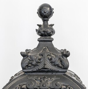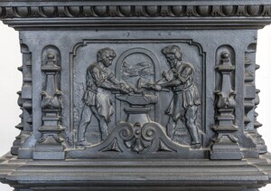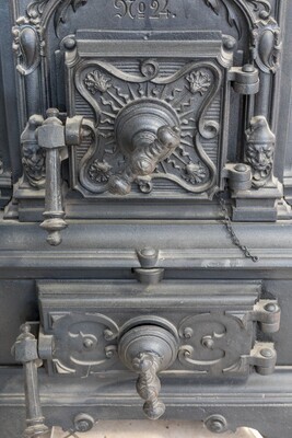 Regulier-Füllofen Nr. 24 aus Eisenguss mit Kuppel produziert in der Concordiahütte in Bendorf-Mülhofen um 1900. Regulierfüllöfen arbeiten mit festem Brennstoff und sind auf Grund ihrer mehrfachen Regulierungsmöglichkeiten von Primär- und Sekundärluft für den Dauerbetrieb geeignet. Dekor: Die Platten der Außenverkleidung mit seitlichen Säulenverzierungen, bei denen der Vorder- und Rückseite der zweiten Etage links eine Kopf- (Masken) und rechts eine Löwenkopfverzierung. Die zweite und dritte Etage seitlich und hinten mit verziertem Wappen, darauf die folgenden Inschriften: 2. Etage links und rechts: Muster, Schutz 2. Etage hinten: Concordia Hütte 3. Etage links, rechts und hinten: Gebr. Lossen Über der unteren Fülltür: Nr. 24 Die unterste Etage an den Seiten und hinten mit jeweils 2 abgeschrägten erhöhten Rechtecken verziert. Die oberste Etage mit Motiven aus dem Handwerk: vorne zwei Schmiede und links und rechts jeweils zwei Böttcher bei der Arbeit. Der Abschlussrahmen dachähnlich geformt mit Schindelmuster, der Deckel durchbrochen, an den vier Seitenmitten Wappenverzierung, der obere Abschluss des Deckels durch Knauf verziert. Aufbau des Ofens: Sockel mit ausgeformten Standfüßen und einer Bodenplatte, vier Etagen, die unterste als Aschenfall mit Aschenkasten und durch Bügelhebel verschließbare Aschentür, die Tür mit kreisrunder durch Schraubverschluß zu schließende Öffnung zur Luftregulierung, die zweite und dritte Etage (beide mit Schamotte ausgemauert und unterhalb der unteren Fülltür Zackenrost) als Feuerraum mit jeweils einer Fülltür, die untere durch Bügelhebel verschließbare mit kreisrunder durch Schraubverschluß zu schließender Öffnung zur Luftregulierung, die obere durch Riegelverschluß verschließbar und mit verschließbaren Luftschlitzen, die vierte Etage mit rückseitigem Ofenrohranschluß, oberer Abschluß des Ofens durch dachähnlich geformte Rahmen, einen Wasserbehältereinsatz und einergewölbten durchbrochenen Kuppel. Jede Etage besteht aus vier Platten, die Seitenplatten mit Bügeln durch die Ecken der Stirn- und Rückseite gehalten, die Platten im Rahmen eingesetzt, die unteren drei Etagen durch vier unter der Bodenplatte verschraubte Eisenstäbe zusammengehalten, die vierte durch zwei Eisenstäbe verschraubt, der Rahmen, der Wasserbehälter und die Kuppel lose aufgesetzt.