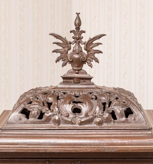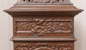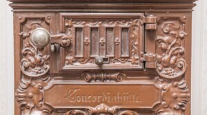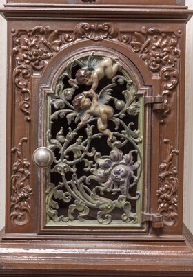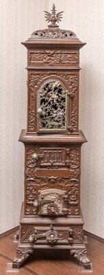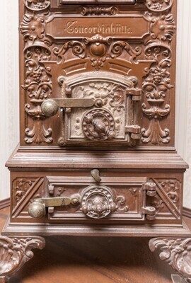 Emaillierter gusseiserner Regulier-Füllofen Nr. 31 mit Kuppel hergestellt in der Concordiahütte in Bendorf-Mülhofen. Aufbau: Rahmen mit Bodenplatte auf vier angeschraubten Füßen, vier Etagen, die unterste als Aschenfall mit Aschenkasten und durch Bügelhebel verschließbare Aschentür, die Tür mit kreisrunder durch Schraubverschluß zu schließender Öffnung zur Luftregulierung, die zweite Etage als Feuerraum mit zwei durch Bügelhebel verschließbaren Fülltüren, innen mit Schamotte ausgemauert, unterhalb der unteren Fülltür Schüttelrost, die obere Fülltür mit verschließbaren Luftschlitzen, die untere oben abgerundete Fülltür mit kreisrunder durch Schraubverschluß zu schließender Öffnung zur Luftregulierung. Die dritte Etage als Kochraum, mit zwei Einsatzringen versehene Kochplatte, Trennwänden und einer oben abgerundeten durchbrochenen, durch seitlich angebrachten Klemmverschluß zu schließenden Tür, die vierte Etage mit ovalem Ofenrohranschluß auf der Rückseite, ein Abschlußrahmen, eine rechteckige Abdeckplatte und eine gewölbte durchbrochene Kuppel. Jede Etage besteht aus vier Platten, die Seitenplatten durch Bügel der Stirn- und Rückseite gehalten, die Platten in Rahmen eingesetzt, die Etagen durch zwei unter der Bodenplatte verschraubte Eisenstäbe zusammengehalten, Rahmenabschluß, Abdeckplatte und Kuppel lose aufgesetzt. Der Kochraum durch separate Verkleidungen getrennt. Alle Türgriffknöpfe vernickelt. Wirkungsweise: Die untere Fülltür für vorübergehende, die obere für stetige Heizung. Bei Dauerbrand wird die untere Fülltüröffnung mit einem einhängbaren Schamotterost verschlossen. Das Feuer zieht in der ganzen Breite des Ofens unter der Kochplatte entlang, an den Seiten des Kochraums nach oben zur Esse. Heizkraft ca. 150 Kubikmeter. Maße des Kochraums: Höhe 24 cm, Breite 20 cm, Tiefe 23 cm. Dekor: Der emaillierte Ofen auf der Rückseite glatt und ohne, sonst bis auf die oberste Etage mit vegetabilen Verzierungen, außerdem noch folgende Verzierungen: Stirnseite: 4.Etage: zwei übereinander fliegende Vögel fast mittig 3. Etage: Schmetterling links oben 2. Etage: zwei Vasen links und rechts der unteren Fülltür 1. Etage: schräg geteilte quadratische Felder mit Blütenverzierung Seiten: 3. Etage: ein auf einem Zweig sitzender Vogel 2. Etage: ein schaukelnder Engel 1. Etage: mittig Blüte in quadratischem Feld und links und rechts davon Blütenverzierungen in schräg geteilten quadratischen Feldern. Die rundbogenförmige durchbrochene Tür des Kochraums mit vegetabilen Verzierungen einer großen Blüte unten rechts und zwei Engeln. Die gewölbte Kuppel mit durchbrochenem floralen Rautenwerk, der Griff als plastisches Ornament: mittig aufwachsende Blüte, rechts und links Flügel. Der Ofen mit folgender Emaillierung: Außenplatten rehbraun, die Kochraumtür: vegetabile Verzierung hell- und dunkelgrün, die große Blüte violett, die Körper der beiden Engel fleischfarben, die Haare braun, die Flügel dunkelgrün. Die Verzierung des Ofens teilweise mit Goldbronze bemalt. Modell: Concordia-Hütte um 1900.