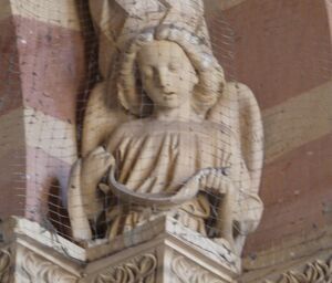 Halbfigur eines Engels auf einer rechteckigen Platte. Es handelt sich um einen von sechs Engeln, auf einem Absatz des zur Eingangspforte hin abgestuften Rundbogens des Hauptportals des Domes von Speyer, mit Schriftband. Der Engel steht auf der linken Seite vor dem Bronzeportal. Er ist in eine faltenreiche Tunika gekleidet, die in der Hüfte gegürtet ist. Der Halsausschnitt des Kleides ist eckig und gesäumt von einem breiten Zierband. Seine Haare sind nackenlang und in der Mitte gescheitelt. Die nach oben gekämmten, gewellten Haare umgeben das Haupt kranzartig. Der Engel liest, den Blick auf das Schriftband gesenkt, das über seinem rechten Arm liegt und das er mit der linken Hand festhält. Vermutlich handelt es sich bei dem lesenden Engel um den Abguss einer Figur, die der Bildhauer Josef Gasser gefertigt hat. Die in Stein gefertigte Skultur befindet sich im Speyerer Dom.