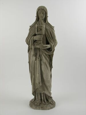 Nach links gerichtetes Halbfigurenporträt einer Bürgersfrau mit weißer Rüschenhaube und blauem Seidenband. Sie hat ein volles Gesicht und trägt ein Schultertuch mit Rüschen, in den Händen hält sie einen Fächer.