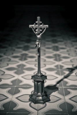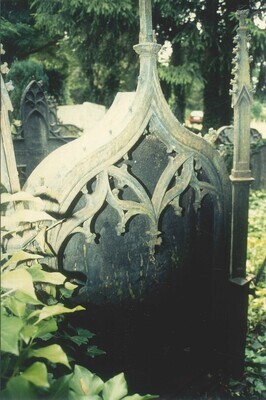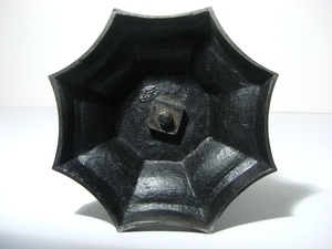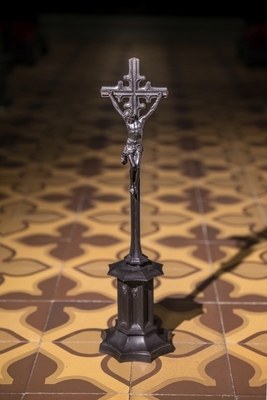Eisenguss. Kruzifix im gotischen Stil mit Corpus Christi (nach rechts blickend, mit Lendentuch) auf achtseitigem Sockel mit Maßwerkfenstern. Auf der Unterseite ist die Gussmarke der königlich-preußischen Sayner Hütte "S.H." in ovaler Kartusche zu erkennen. Dieses Kreuz im gotischen Stil ist im Musterbuch 3 der Sayner Hütte, das im Historischen Archiv Krupp in Essen aufbewahrt wird, abgebildet.