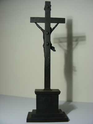 Eisenguss geschwärzt. Altarkreuz mit Corpus Christi. Christus mit Dornenkrone blickt nach rechts unten. Das Lendentuch ist in der Körpermitte verknotet und die Tuchenden hängen an der rechten Seite herunter. Oben am Kreuz ist die Tafel mit der Inschrift "INRI" befestigt. Auf Sockelvorderseite sind zwei sich überkreuzende Kränze aus Ähren und Weinlaub mit Trauben befestigt.