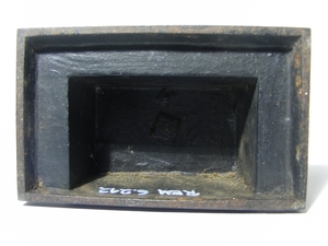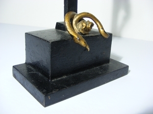 Eisenguss geschwärzt und teilweise vergoldet. Altarkreuz mit Corpus Christi. Christus mit Dornenkrone blickt nach rechts unten. Das Lendentuch ist in der Körpermitte verknotet und die Tuchenden hängen an der rechten Seite herunter. Oben am Kreuz ist die Tafel mit der Inschrift "INRI" befestigt. Am Fuß des Kreuzes sind eine Schlange und ein Totenkopf montiert.
