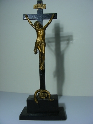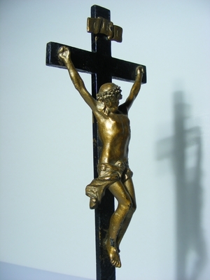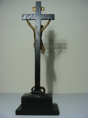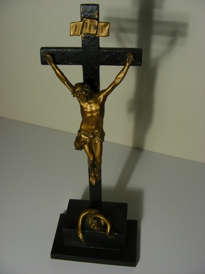Eisenguss geschwärzt und teilweise vergoldet. Altarkreuz mit Corpus Christi. Christus mit Dornenkrone blickt nach rechts unten. Das Lendentuch ist in der Körpermitte verknotet und die Tuchenden hängen an der rechten Seite herunter. Oben am Kreuz ist die Tafel mit der Inschrift "INRI" befestigt. Am Fuß des Kreuzes sind eine Schlange und ein Totenkopf montiert.