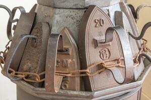 Gusseiserner Bügeleisenofen oder Plättofen mit 3 geschwungenen Füßen. Der Ofen gliedert sich in vier Teile: Füße, Aschekasten, Anstellfläche für Bügeleisen, Kochplatte. Zum Ofen gehören 12 Bügeleisen (6.222 a-l) und ein Bügeleisenständer mit Palmettenzier (6.222 m) aus Eisenguss. Solche Öfen waren ab Mitte des 19. Jahrhunderts in Schneidereien, bei Hutmachern und in Wäschereien im Einsatz. Viele Bügeleisenöfen dienten nicht nur der Erhitzung der Bügeleisen, sondern gleichzeitig als Koch- und Heizofen.