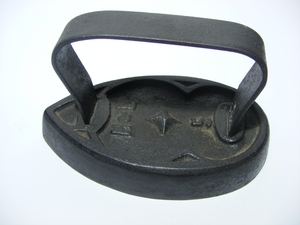 Gusseiserner Bügeleisenofen oder Plättofen mit 3 geschwungenen Füßen. Der Ofen gliedert sich in vier Teile: Füße, Aschekasten, Anstellfläche für Bügeleisen, Kochplatte. Zum Ofen gehören 12 Bügeleisen (6.222 a-l) und ein Bügeleisenständer mit Palmettenzier (6.222 m) aus Eisenguss. Solche Öfen waren ab Mitte des 19. Jahrhunderts in Schneidereien, bei Hutmachern und in Wäschereien im Einsatz. Viele Bügeleisenöfen dienten nicht nur der Erhitzung der Bügeleisen, sondern gleichzeitig als Koch- und Heizofen.