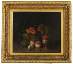 Stillleben mit Weinlaub, Trauben, Pfirsichen und Aprikosen, die auf einer Tischplatte liegen, daneben steht ein violettes Henkelkrüglein mit Erdbeeren. Eine weiße Maus nascht Körner aus einem Näpfchen. Bez.re unten: "J: Schlesinger 1833" Johann Schlesinger war zunächst Schüler seines Bruders Johann Adam. Er arbeitete in der Tradition holländischer Stilleben-Maler des 17. Jh.. Er lebte und wirkte hauptsächlich in Mannheim. Oft malte er Stillleben, war aber auch ein gesuchter Porträtist. Gerade seine biedermeierlichen Porträtdarstellungen haben einen außerordentlichen Reiz. Quelle: Joachim Specht, Wikipedia