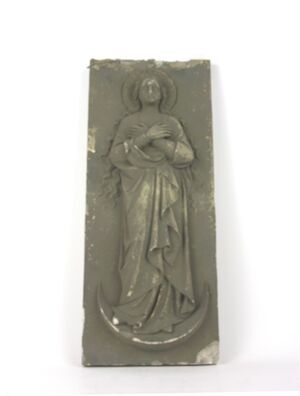 Das Bild zeigt eine junge stillende Frau in freier Landschaft. Links von ihr steht eine Ziege. Rechts neben ihr liegen ein Hund und ein Mann auf dem Boden. Im Hintergrund geht die Sonne auf. ggf. Anklänge an den Motivkreis der Heiligen Familie auf der Flucht nach Ägypten.