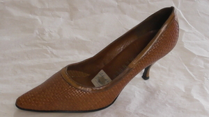 Ein einzelner Pumps aus schwarzem Veloursleder. Spitze Form, mit Kunstleder bezogener Pfennigabsatz (ca. 6cm) mit Metallspitze. Die Spitze des Schuhs besteht aus Kunstleder. Der Schuh ist mit dem originalen Fabrikanhänger versehen. Hergestellt von der Firma Salamander in Kornwestheim (D). Leider undatiert.