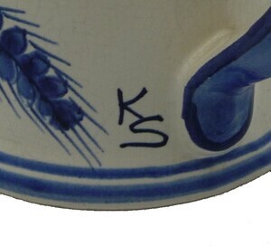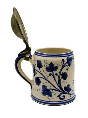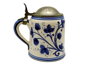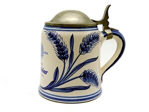 Bierkrug der Mainzer Brauerei zur Sonne (oder Sonnenbrauerei) zum 400. Jubiläum 1568-1968, mit Zinndeckel. Das weiße Gefäß ist kobaltblau bemalt mit Hopfen und Gerste. Mittig prangt das aufgedruckte Logo der Brauerei zur Sonne. Der Krug fasst 0,5 Liter. Signiert ist der Krug mit KS.