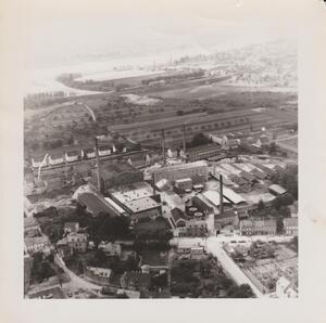 Schwarzweißfotografie. Diese Luftaufnahme zeigt das Gelände der "Didier-Werke", an der Concordiastraße in Bendorf. Außerdem im Bild erkennbar sind die Hauptstrasse und die Karl-Fries-Straße. Im Hintergrund zu sehen ist die Langfuhr mit ihren großen unbebauten Ackerflächen. Die Didier-Werke waren eine der ältesten Produktionsstätten für feuerfeste Materialien für die Eisen- und Stahlindustrie. Im Jahr 1842 gründete Theodor Neizert auf dem Gelände zwischen Hauptstraße, Alter Weg und Concordiastraße eine Fabrik für feuerfeste Produkte. Im Jahr 1895 kam es zu Gründung einer Aktiengesellschaft mit den "Rheinischen Chamotte und Dinaswerken", während Theodor Neitzert aus der Firma ausschied und die Firma Neitzert; die spätere Firma Lüngen an der Hauptstraße errichtete. 1968 wurden die Rheinischen Chamotte und Dinaswerke von dem Konzern Didier übernommen, bis es im Jahr 1995 zur Schließung des Standortes in Bendorf kam. Heute befindet sich auf jenem Gelände das Einkaufszentrum "Kaufland".