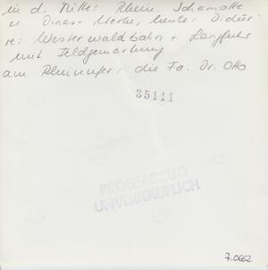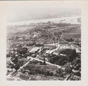Schwarzweißfotografie. Diese Luftaufnahme zeigt das Gelände der "Didier-Werke", an der Concordiastraße in Bendorf. Am rechten Bildrand ist die Trasse der Westerwaldbahn und die Gemarkung Langfuhr mit ihren unbebauten Ackerflächen zu erkennen. Im Hintergrund unmittelbar am Rheinufer liegt die ehemalige Firma Dr. Otto mit Ihrem charakteristischen Wasserturm. Die Didier-Werke waren eine der ältesten Produktionsstätten für feuerfeste Materialien für die Eisen- und Stahlindustrie. Im Jahr 1842 gründete Theodor Neizert auf dem Gelände zwischen Hauptstraße, Alter Weg und Concordiastraße eine Fabrik für feuerfeste Produkte. Im Jahr 1895 kam es zu Gründung einer Aktiengesellschaft mit den "Rheinischen Chamotte und Dinaswerken", während Theodor Neitzert aus der Firma ausschied und die Firma Neitzert; die spätere Firma Lüngen an der Hauptstraße errichtete. 1968 wurden die Rheinischen Chamotte und Dinaswerke von dem Konzern Didier übernommen, bis es im Jahr 1995 zur Schließung des Standortes in Bendorf kam. Heute befindet sich auf jenem Gelände das Einkaufszentrum "Kaufland".
