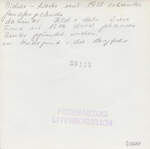 Schwarzweißfotografie. Diese Luftaufnahme zeigt das Gelände der "Didier-Werke" mit dem 1938 erbauten Gasofengebäude, an der Concordiastraße in Bendorf. Dahinter liegt die im Jahre 1876 durch Johannes Reuber gegründete Firma Feld & Hahn. Die Didier-Werke waren eine der ältesten Produktionsstätten für feuerfeste Materialien für die Eisen- und Stahlindustrie. Im Jahr 1842 gründete Theodor Neizert auf dem Gelände zwischen Hauptstraße, Alter Weg und Concordiastraße eine Fabrik für feuerfeste Produkte. Im Jahr 1895 kam es zu Gründung einer Aktiengesellschaft mit den "Rheinischen Chamotte und Dinaswerken", während Theodor Neitzert aus der Firma ausschied und die Firma Neitzert; die spätere Firma Lüngen an der Hauptstraße errichtete. 1968 wurden die Rheinischen Chamotte und Dinaswerke von dem Konzern Didier übernommen, bis es im Jahr 1995 zur Schließung des Standortes in Bendorf kam. Heute befindet sich auf jenem Gelände das Einkaufszentrum "Kaufland".