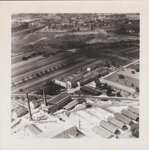 Schwarzweißfotografie. Diese Luftaufnahme zeigt das Gelände der "Didier-Werke" mit dem 1938 erbauten Gasofengebäude, an der Concordiastraße in Bendorf. Dahinter liegt die im Jahre 1876 durch Johannes Reuber gegründete Firma Feld & Hahn. Die Didier-Werke waren eine der ältesten Produktionsstätten für feuerfeste Materialien für die Eisen- und Stahlindustrie. Im Jahr 1842 gründete Theodor Neizert auf dem Gelände zwischen Hauptstraße, Alter Weg und Concordiastraße eine Fabrik für feuerfeste Produkte. Im Jahr 1895 kam es zu Gründung einer Aktiengesellschaft mit den "Rheinischen Chamotte und Dinaswerken", während Theodor Neitzert aus der Firma ausschied und die Firma Neitzert; die spätere Firma Lüngen an der Hauptstraße errichtete. 1968 wurden die Rheinischen Chamotte und Dinaswerke von dem Konzern Didier übernommen, bis es im Jahr 1995 zur Schließung des Standortes in Bendorf kam. Heute befindet sich auf jenem Gelände das Einkaufszentrum "Kaufland".