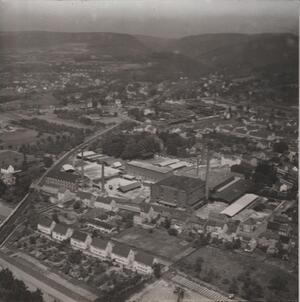 Schwarzweißfotografie. Diese Luftaufnahme zeigt das Gelände der "Didier-Werke", an der Concordiastraße in Bendorf, darunter erkennbar ist die Wiegand-Siedlung (im Besitz der Concordia-Hütte). Am oberem Bildrand zu sehen sind die Trasse der Westerwaldbahn und der Taleinschnitt des Saynbaches. Die Didier-Werke waren eine der ältesten Produktionsstätten für feuerfeste Materialien für die Eisen- und Stahlindustrie. Im Jahr 1842 gründete Theodor Neizert auf dem Gelände zwischen Hauptstraße, Alter Weg und Concordiastraße eine Fabrik für feuerfeste Produkte. Im Jahr 1895 kam es zu Gründung einer Aktiengesellschaft mit den "Rheinischen Chamotte und Dinaswerken", während Theodor Neitzert aus der Firma ausschied und die Firma Neitzert; die spätere Firma Lüngen an der Hauptstraße errichtete. 1968 wurden die Rheinischen Chamotte und Dinaswerke von dem Konzern Didier übernommen, bis es im Jahr 1995 zur Schließung des Standortes in Bendorf kam. Heute befindet sich auf jenem Gelände das Einkaufszentrum "Kaufland".