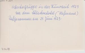 Schwarzweißfotografie einer Arbeitergruppe in der sog. Cuno-Zeit (benannt nach dem ehemaligen Reichskanzler Dr. Wilhelm Cuno) vor dem "Schlackenhotel", dem Empfangsgebäude für Passagiere der Personendampfschiffe (heute Hafenamt), aufgenommen am 23. Juni 1923.
