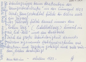 Schwarzweißfotografie. Arbeitergruppe beim Straßenbau im Wenigerbachtal in der sog. Cuno-Zeit (benannt nach dem Reichskanzler Dr. Cuno) 1923. Durch das Wenigerbachtal führte bis dahin nur ein Fußweg. Der Fußweg führte damals immer den "Rothen Weg" (Eichelhohlweg) hinauf in die "Eichel-Hell" und den Stadtwald. Durch die große Arbeitslosigkeit damals wurden sogenannte Notstandsarbeiten wie Strassen- und Wegebau getätigt und viele wurden dabei beschäftigt. Oben ganz rechts: Anton Berg Mittlere Reihe, zweiter von rechts: Jakob Müller
