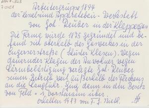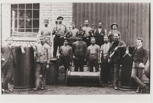 Schwarzweißfotografie. Das Bild zeigt eine Arbeitergruppe im Jahre1894 der Kessel -und Apparatebau-Werkstatt von Johann Reuber in der "Klappergasse" (= Concordiastraße). 1875 gründete Johann Reuber aus Bendorf eine Kesselschmiede. Sie befand sich oberhalb des Gaswerkes in der Engerserstraße in Bendorf. Wegen andauernder Klagen der Anwohner wegen Lärmbelästigung verlegte Johann Reuber seinen Betrieb schließlich außerhalb der Ortsmitte in die Langfuhr, in die Concordiastraße. Der Betrieb ging 1896 in den Besitz der Firma des Ingenieurs Ernst Feld. 1902 trat der Ingenieur Adrianus G. L. Vorstmann als Teilhaber in die Firma ein. Die Firma nannte sich fortan „Feld & Vorstmann GmbH“. Während der Wirtschaftskrise der 1928-1930er Jahre geriet die Firma in finanzielle Schwierigkeiten. Der Ingenieur Josef Hahn trat als Teilhaber und Geldgeber in die Firma ein, die nun unter dem Namen „Feld & Hahn GmbH. Fabrik für Apparate- und Dampfkesselbau firmierte.